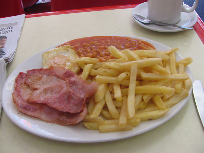 Now this looks as good as most of Russel’s cafes. The cup of coffee was lovely and fresh, the smiles genuine and the price fair. The beans were desperately clinging to the edge of the plate, not to be pushed into the abyss by the generosity of the cook. The chips were lovely and not too dark, while the bacon made an almost teutonic statement of hegemonical prowess draped over a a third of the porcellain, and only the egg retained a modicum of modesty.