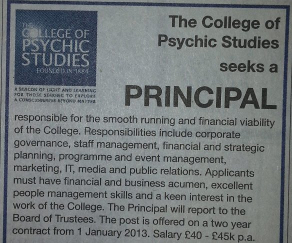 They now offer courses in Meditation, Energy Work (I assume that has nothing to do with electricians), Divination,  Psychic Development, Trance and Healing. They also advertised for the position of Principal in yesterday’s Guardian. Now, I am not sure how evidence based their methods are and how grounded in physics their offerings are, but for instance the course “Mediumship” offers the aspiring medium: