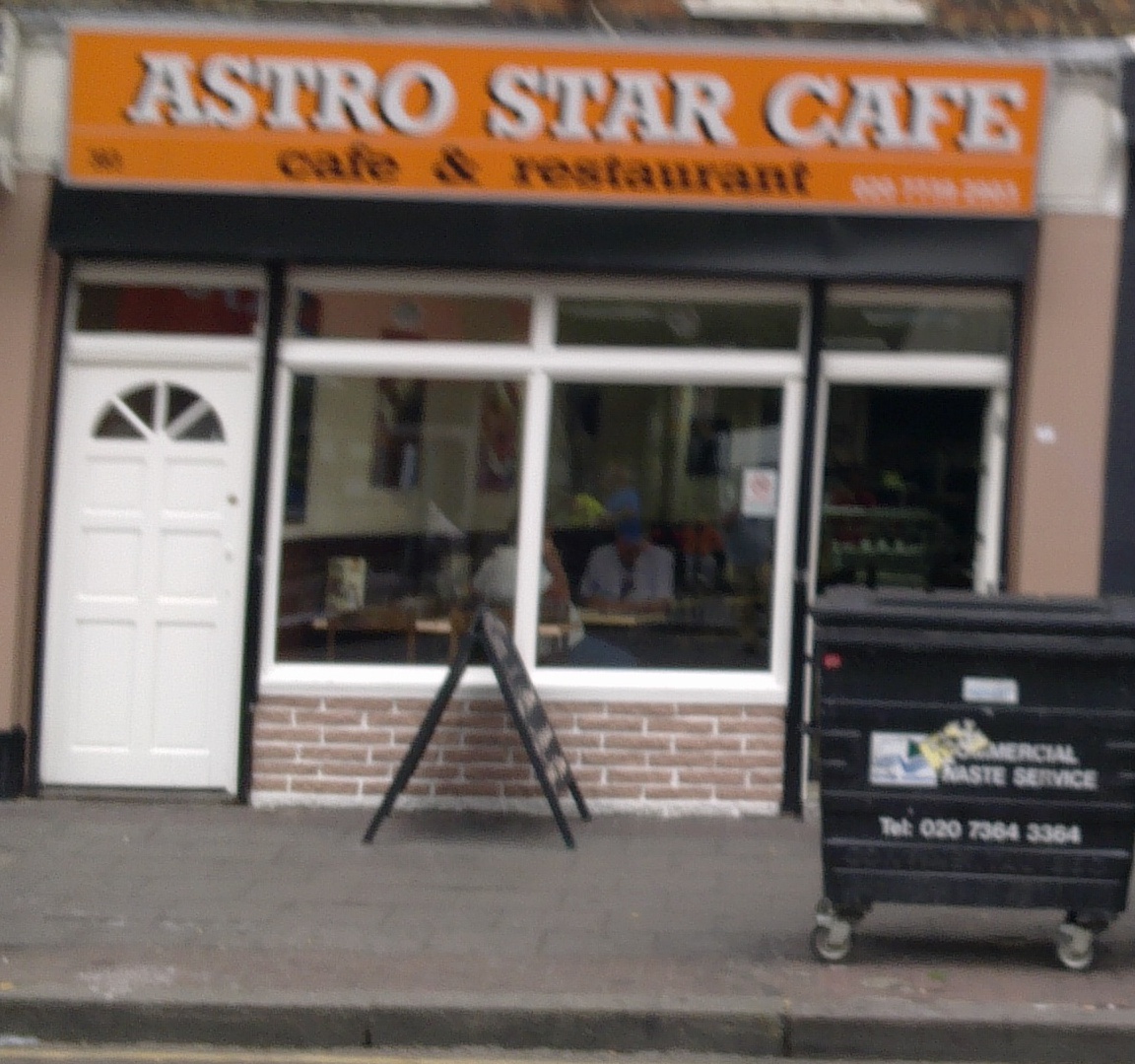 Today my travels took my into the western East End and I was in need of breakfast. When I saw the sign, I knew this had to be tried. Who knows, the owner might be a famous science – fiction writer or an astrophysicist (or a Zoroastrianist). The amazingly and appropriately named Astro Star Cafe is situated in the middle of hip and happening Bethnal Green in the almost East End of London (also colloquially known as the centre of the known universe). As you can see, the Cafe is rather blurry and has a distinctive right shift. A physical phenomenon directly attributable to its name.
