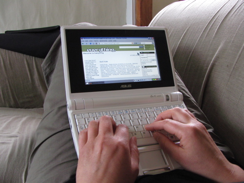 It’s pleasant on the eye, balances well on my lap and fits perfectly into my work bag. Unfortunately the batttery is completely pish. While watching Little Britain USA (which, btw was rubbish) the battery drained almost cmpletely, and I presume that under full load the battery wouldn’t last longer than an hour. No comparison to my Macbook that would happily run for 5 hours. So no long train journeys or flights to New Zealand in economy class then.
